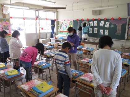 新6年生が登校し、入学式準備をしました。1年生の教室で配布物をそろえたり、黒板に絵を描いたりする子、体育館でいすを並べたり、渡りの掃除をしたりする子、どの子からも「1年生を気持ちよく迎えよう」という気持ちが伝わってきました。