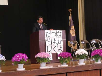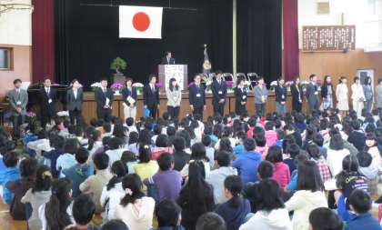 体育館に入り、まずは新たに本校に赴任された先生の着任式を行い、8人の先生一人一人から、北っ子へのメッセージをいただきました。1学期の始業式では、校長先生から、校訓「ただしく つよく なかよく」についてのお話がありました。その後、いよいよお待ちかねの「担任の先生の発表」。総勢51名のスタッフが801名の子どもたちの成長をサポートします。