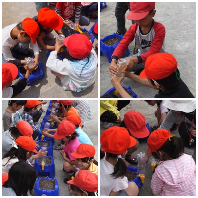 あさがおの種まき(1・2年生) 公開日 2014/05/08 更新日 2014/05/08 今日のできごと ○ 5月8日(木) 1・2年生のペアであさがおの種まきをしました。2年生に教えてもらって種まきをした後で、水もペアで仲良くあげました。 いいね(0)