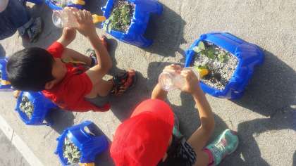 ○ 5月23日(金) 1年生が、大切に育てているあさがおの双葉の間に本葉が出てきました。