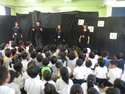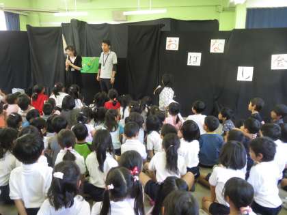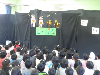 おはなし会 2日目 公開日 2014/05/28 更新日 2014/05/28 その他 5月28日(水) 今日の「おはなし会」は、人形劇「おにがしまの とらがり」でした。「鬼のパンツ」の歌と踊りから始まりです。新しいパンツがほしい鬼が、「とらがしま」に虎刈りに行ったのですが…………。鬼の役でゲスト出演した1年生の男の先生は、セリフがたくさんあり大活躍でした。 いいね(0)