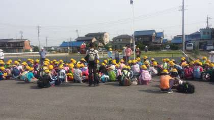 ○ 5月30日(金) 野外学習1日目がスタートしました。天候に恵まれ、出発式を行っています。