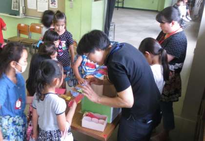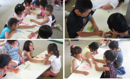 図書ボランティア掲示グループ「OPEN SESAME」の皆さんが、ふれあいホールで七夕の願いごとを書く短冊を配ってくださいました。短冊をもらった子どもたちは、さっそく思い思いの願いごとを短冊に書いていました。短冊は、図書館の笹に飾られます。
