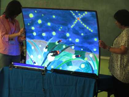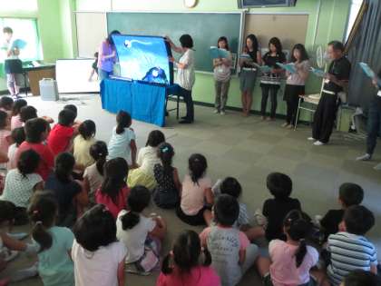 2時間目の放課にふれあいホールで、図書ボランティア「スマイル」の皆さんによる「ミニおはなし会」がありました。大型紙芝居ブラックシアターで「とべないホタル」を演じていただきました。バックコーラスに合わせて、本当にホタルが飛んで来そうな雰囲気のすてきな「おはなし会」でした。