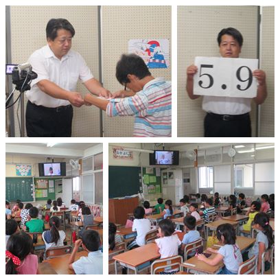 はじめにユニセフから届いた感謝状が児童会代表に渡されました。校長先生からは、本校児童の保護者でもあり、防犯教室などでお世話になっている石黒先生が、50メートル5秒9の記録をもってみえること、マスターズの陸上競技選手権大会のM40クラスの4×100メートルリレーで、マスターズのアジア記録と日本記録を更新されたこと、世界記録にもあと0.05秒まで迫るすばらしい記録を出されたことを紹介され、目標をもって取り組むことのすばらしさ、尊さについてお話がありました。