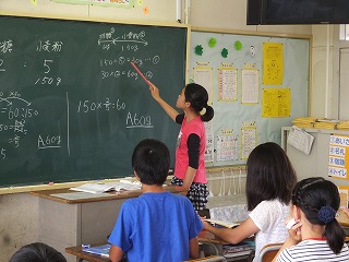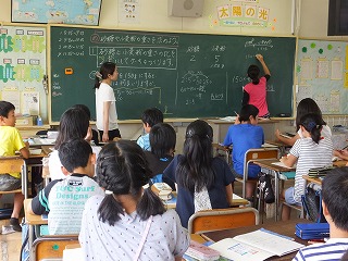 算数の「比をつかっ問題」の授業の様子です。「砂糖と小麦粉の重さの比を2:5にしてケーキを作ります。小麦粉を150gにすると砂糖は何gいりますか。」の問題に取り組んでいました。