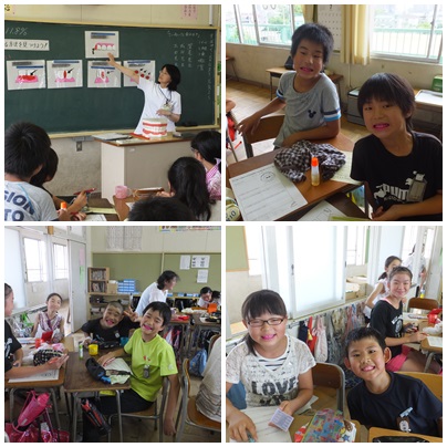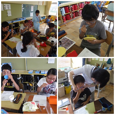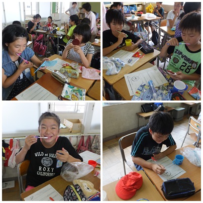 昨日に引き続いて、江南保健所の歯科衛生士、岩倉市保健センターの歯科衛生士、保健師の方々に講師としておいでいただき「ていねいな歯みがきの方法」について教えていただきました。染め出しをして思った以上に赤くなった歯を見て、子どもたちは驚いていました。その後の歯みがきの様子を見ていると、赤く染められたところもすっかりなくなっていました。正しい歯みがきの仕方が、丁寧なご指導のおかげで、よく分かったようです。