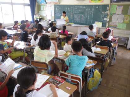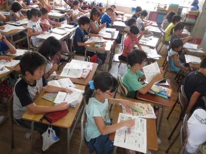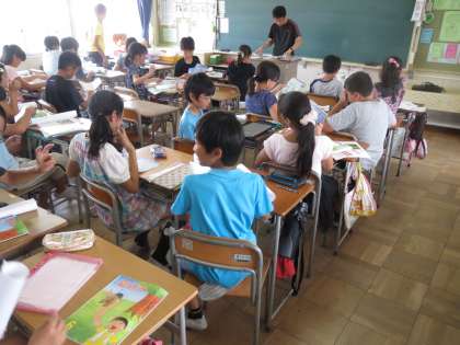 明日は1学期終業式です。今日の5時間目には、夏休みの課題をもらって説明を聞いている学級、夏休みのくらしのめあてを話し合っている学級、暑中見舞いの書き方を練習している学級など、夏休みに向けての準備に取り組んでいる学級がたくさんありました。
