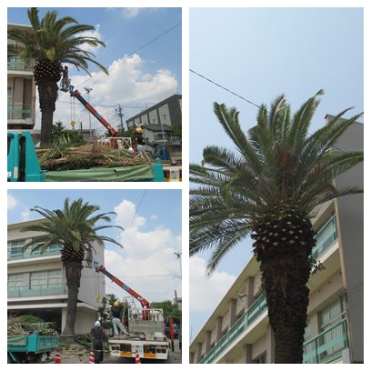 正面玄関わきにあるフェニックスの木を剪定していただきました。校舎の3階にまで届くほど大きく立派な葉が次々と切り落とされ、すっきりとした姿になりました。
