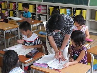 学級活動の時間の様子です。日誌を先生に見せたり、先生の話を聞いたりしています。