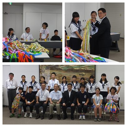 8月9日(土)に長崎で行われる平和祈念式典への参加を中心とした、小中学生平和祈念派遣事業の折鶴預託式が、市役所で行われました。市長さんや議員さんの挨拶のあと、児童生徒一人一人が参加の決意を述べました。また、小中学生や市民が折った折鶴46000羽が代表生徒に託されました。
