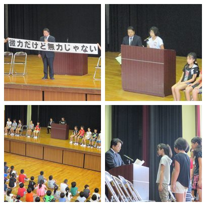 始業式の中で校長先生からは「微力だけど無力じゃない」「感謝の気持ちでものごとに取り組もう」というお話がありました。また、岩倉市平和祈念派遣事業、少年消防クラブ1日体験、尾張地区青少年赤十字リーダーシップトレーニングセンターに参加した6年児童が、体験を通して学んだことを発表し、全校に思いを伝えました。