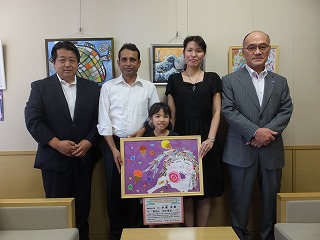 1年生の児童の作品が、市役所の教育長室に掲示されています。本日の昼の休み時間、校長先生と一緒に、教育長室まで絵をもっていきました。教育長先生から「とても細かいところまで工夫してある作品です。紙を手でちぎって、歯や髪の毛を上手に作ることができています。」とほめていただきました。