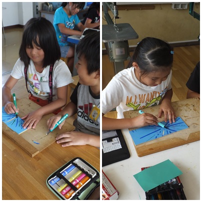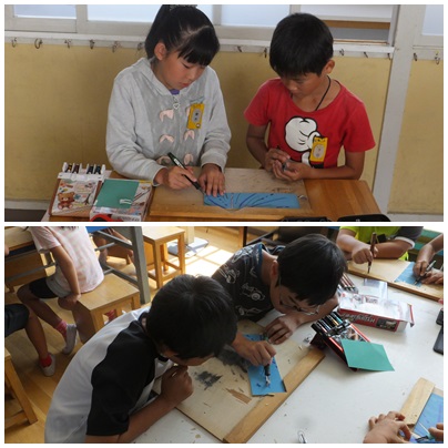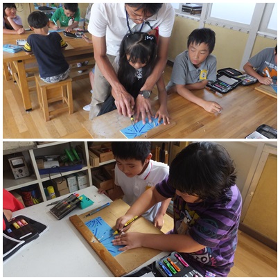彫刻刀(4年生) 公開日 2014/09/30 更新日 2014/09/30 4年生 ○ 9月30日(火) 4年生では、初めて彫刻刀を使って作品を作ります。三角刀や丸刀など、種類によって彫ることができる太さが変わることなどを実際に試し掘りをして確かめています。 いいね(0)