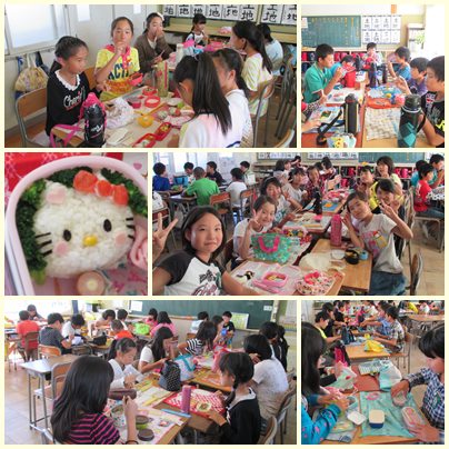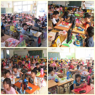台風のため給食がありませんでしたので、教室でお弁当をいただきました。おうちの人の愛情いっぱいのお弁当を前に、会話も弾んでいました。