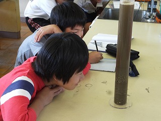 「土地のつくりと変化」(6年生) 公開日 2014/10/07 更新日 2014/10/07 6年生 ○ 10月7日(火) 6年生が、地層のでき方について調べました。水を入れた円筒に砂を流し込んで、どろ、砂、れきの沈み方を観察しました。 いいね(0)