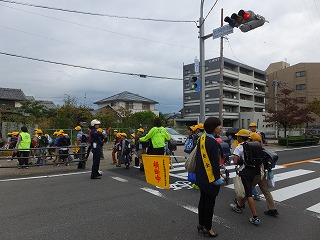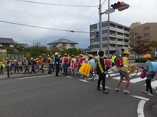 子どもたちは、地域の多くの皆様に見守られて通学班で登校します。本日は、警察の方にも、西市の交差点で子どもたちを見守っていただきました