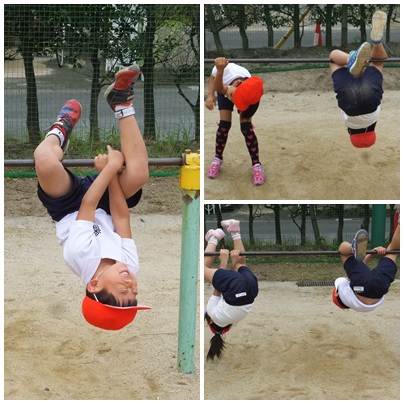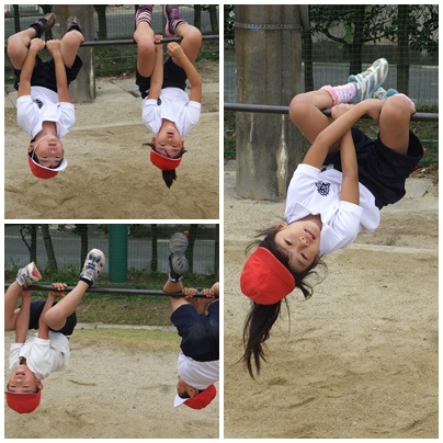 1年生が、鉄棒に取り組んでいます。鉄棒から落ちないように、歯を食いしばってしっかりと鉄棒を握っています。