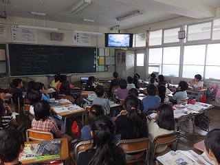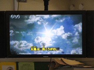 理科の時間に、太陽の動きとかげとの関係についてのまとめを行っていました。前回の授業で、運動場で実際にかげの動きを観察したので、今日は、テレビを見て観察した様子と比べながらまとめを行いました。