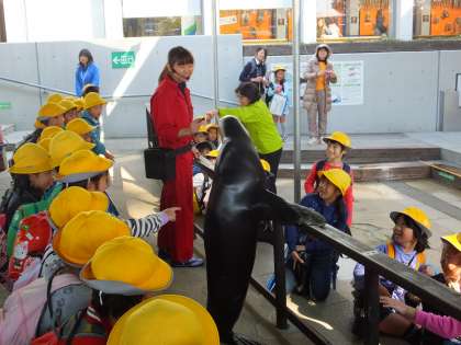 「飼育員さんのお仕事」のお話を聞いたり、アシカショーを見たりしました。間近にアシカがやってきてびっくりの子もいましたが、とても楽しいアシカショーでした。その後、グループごとに館内を見学し、クイズラリーをしました。そして、晴天のもと、お母さん特製のお弁当を食べ、おやつと遊びを楽しみました。月曜日には、遠足新聞を作成する予定です。