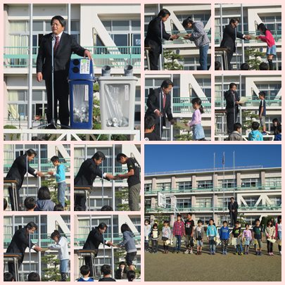 校長先生からは歴代PTA会長有志の皆様が寄付してくださった、アルミ缶回収ボックスの紹介がありました。地域の方々がいつも北小学校のことを見守ってくださっていることに感謝して、学校生活を送りたいものです。