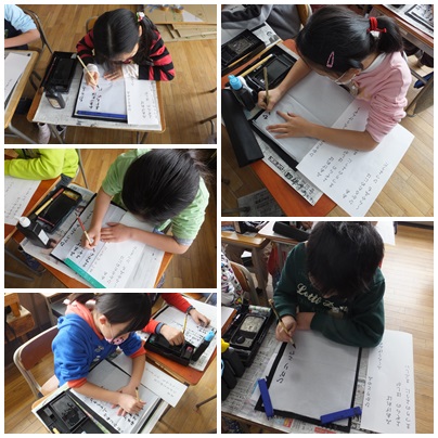 書写(4年生) 公開日 2015/01/21 更新日 2015/01/21 4年生 ○ 1月21日(水) 4年生の書写の授業の様子です。「小筆となかよくなろう」をテーマに、小筆が上手に使えるようにポイントを学習してから、練習に取り組んでいます。 いいね(0)