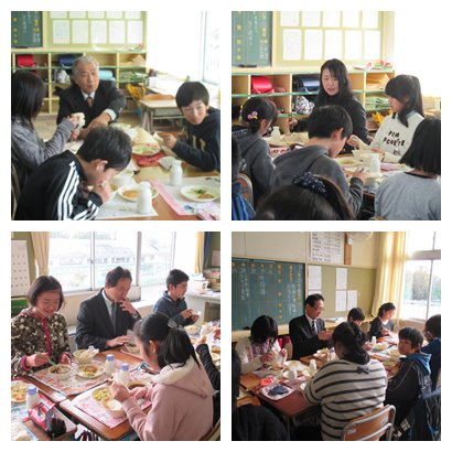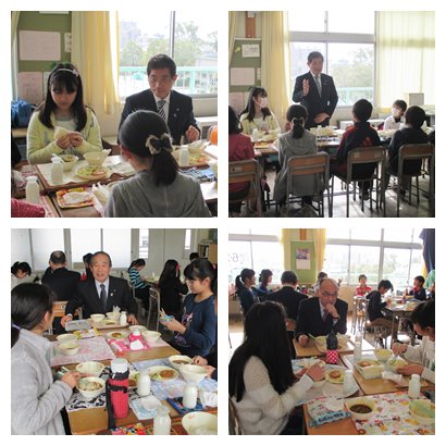 今日は市長さん、教育長さん、議長さん、市議会議員の皆さん、教育委員会の皆さんをお招きしてのふれあい給食会でした。5年生・6年生のそれぞれの教室で給食を一緒に食べました。学校生活のこと、昔の給食のことなど、話がはずみ、楽しい会となりました。