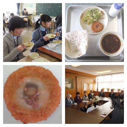 みそかけうどん(白玉うどん) 牛乳 岩倉産野菜コロッケ 岩倉産野菜サラダ でした。特に本日は「食べて知ろう!岩倉の学校給食の日」ということで、岩倉市の郷土料理「みそかけうどん」(昭和初期、岩倉駅にあったうどん屋のまかない料理)や岩倉市の特産物(カリフラワー・ちっチャイ菜)を使った給食でした。また、みつば、キャベツ、ねぎも岩倉産で、コロッケにはい〜わくんがついていました。