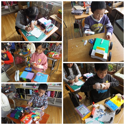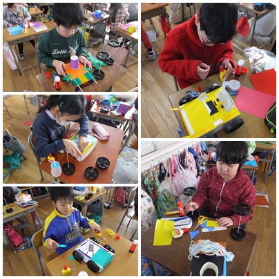 ドリームカー(4年生) 公開日 2015/02/24 更新日 2015/02/24 4年生 ○ 2月24日(火) 4年生が、自分がが想像した夢の車を作っていました。美しい車になるように、飾り付けを工夫していました。 いいね(0)