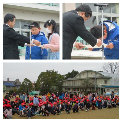 今日は6学年がそろう最後の朝礼でした。はじめにユニバーサルデザイン標語コンクールで入賞した多くの皆さんの表彰を行いました。市長賞、ユニバーサルデザイン協会会長賞の2名の児童が代表で賞状を受け取りました。