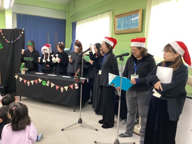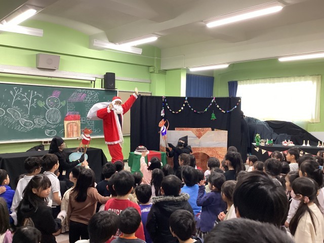 今日のお話会は、クリスマスが近いので、「ぐりとぐらのおきゃくさま」でした。会のはじめには、ハンドベルの演奏もありました。お話の途中でサンタさんも登場して、ふれあいホールは大盛り上がりでした。