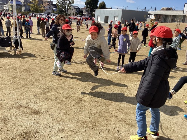 運動場を見たら…2年生、3年生、4年生が縄跳びを行っていました。太陽の光もあり、風もなく、温かな午後でした。