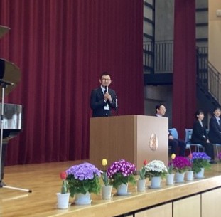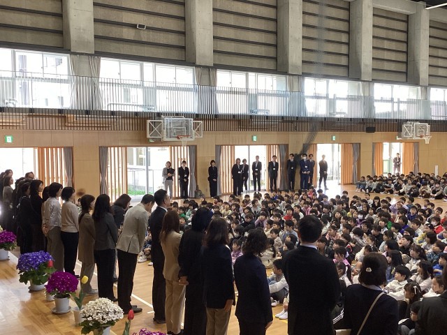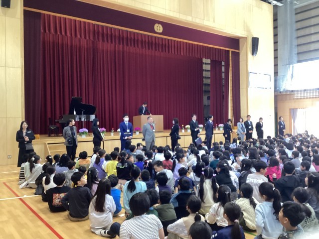 着任式では、本年度よりいらっしゃった6名の先生方が紹介されました。一人ずつお話をされたときには、児童たちは笑顔で一生懸命に話を聞いていました。