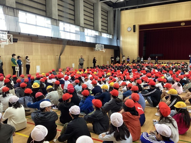 着任式では、本年度よりいらっしゃった6名の先生方が紹介されました。一人ずつお話をされたときには、児童たちは笑顔で一生懸命に話を聞いていました。