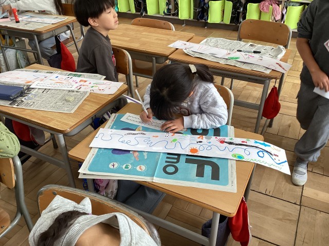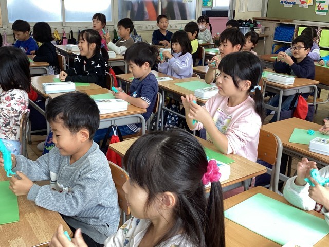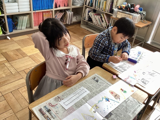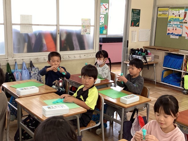 家と花を作ったあとは、自分で形を考えました。魚や鉛筆など、さまざまな形ができていました。