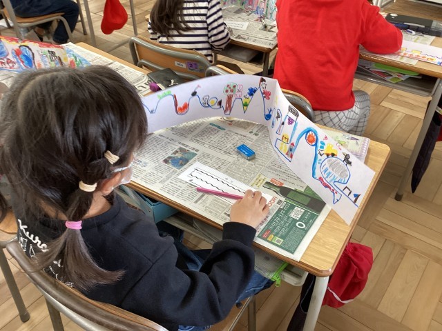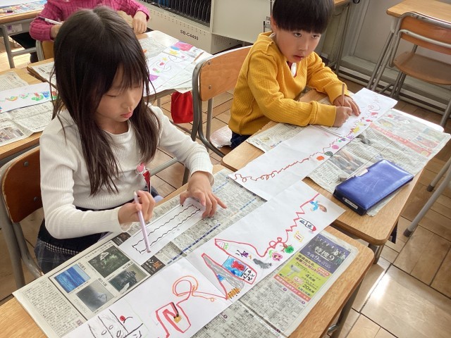 1本の線をかきながら、思い付いた冒険物語の作品にタイトルをつけて仕上げました。