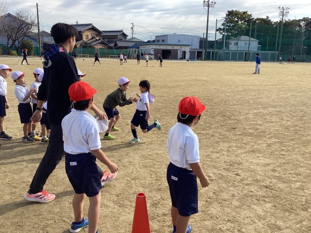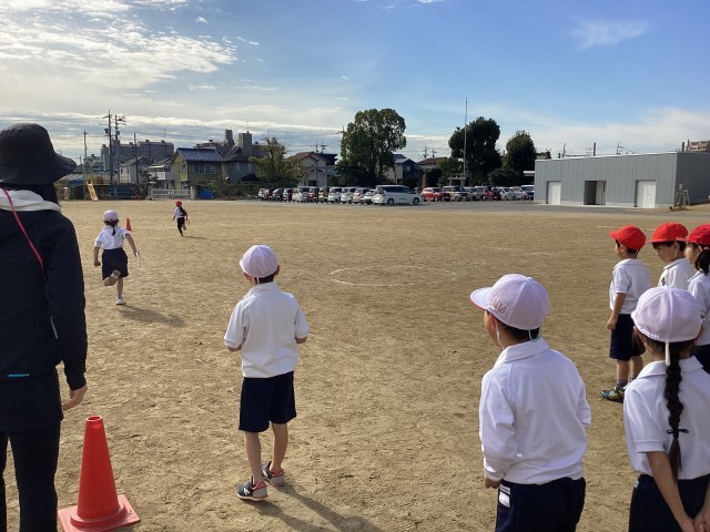 赤と白に分かれて、みんなで応援し合いながらのリレー遊びです。