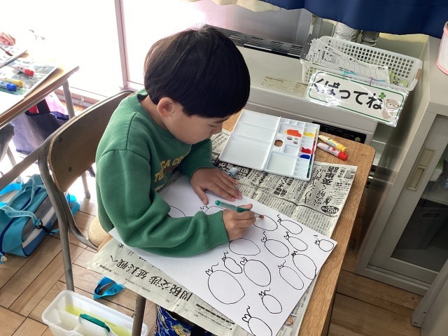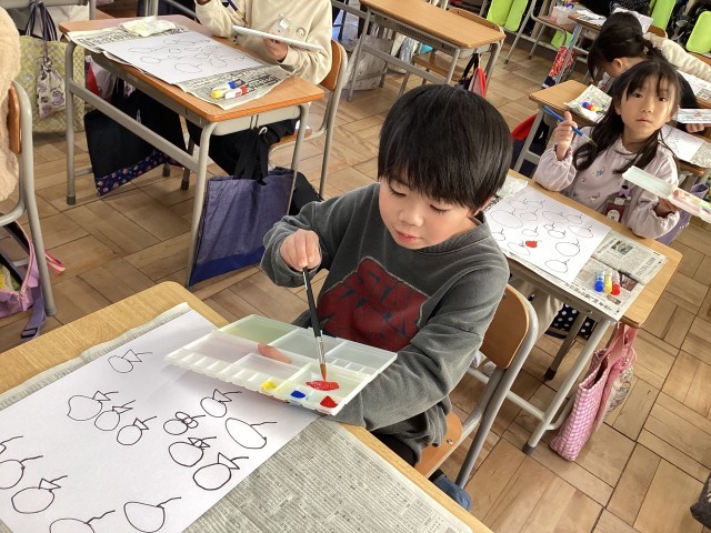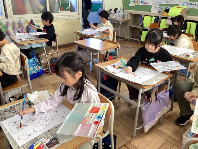 15個の風に飛ぶ風船を、赤・青・黄の3色を使って塗りました。最初は、赤と黄を混ぜてオレンジ色を作りました。みんな少しずつ違う、素敵なオレンジ色の風船ができていました。