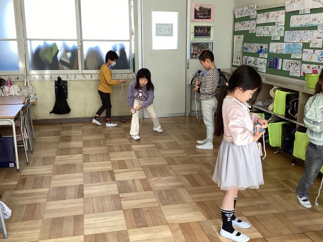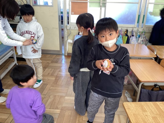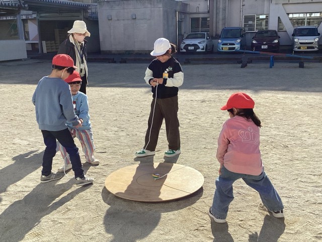 昔から伝わる遊び「こま回し」に挑戦しています。