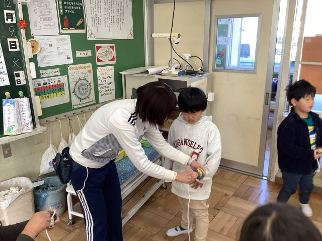 どんくりや松ぼっくりを使って作ったおもちゃで楽しい時間を過ごしました。迷路やけん玉、とても楽しそうでした。