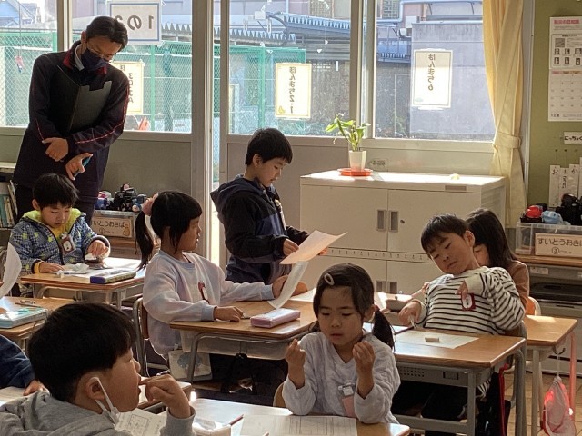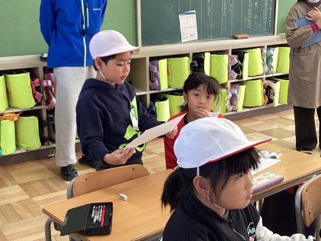絵から想像して作ったお話をみんなで読み合い、感想を伝え合いました。みんなしっかりお話を作れていて、1年生の成長が感じられた場面でした。