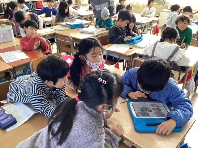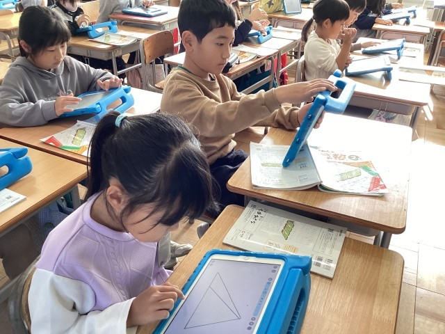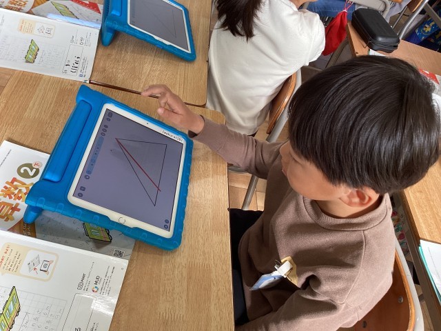 タブレット端末を使って、三角形を2つに切って三角形や四角形を作りました。何通りか切り方を考えて、理解を深めました。