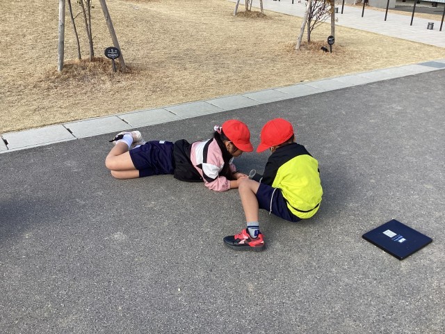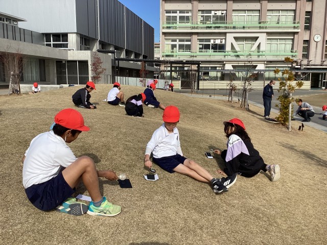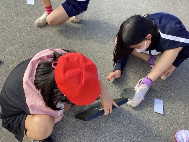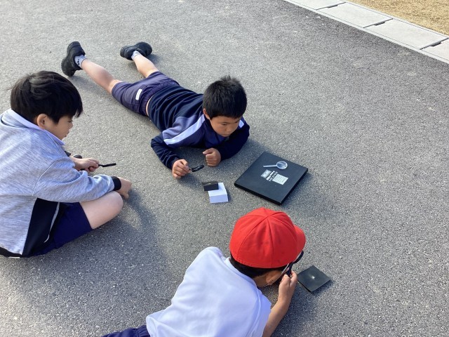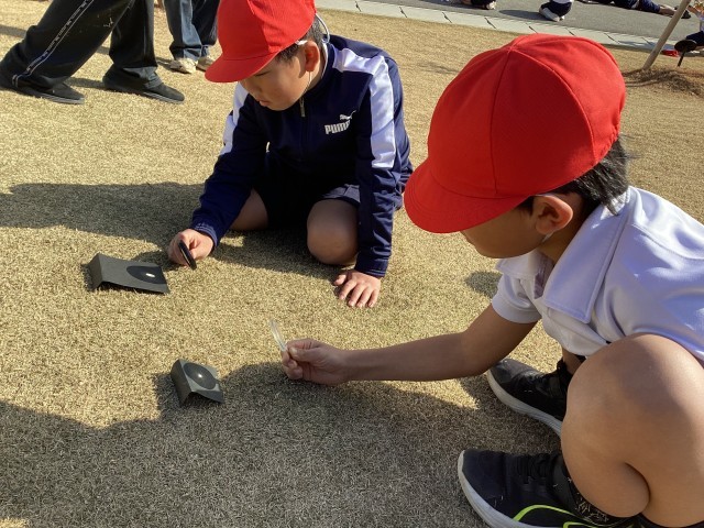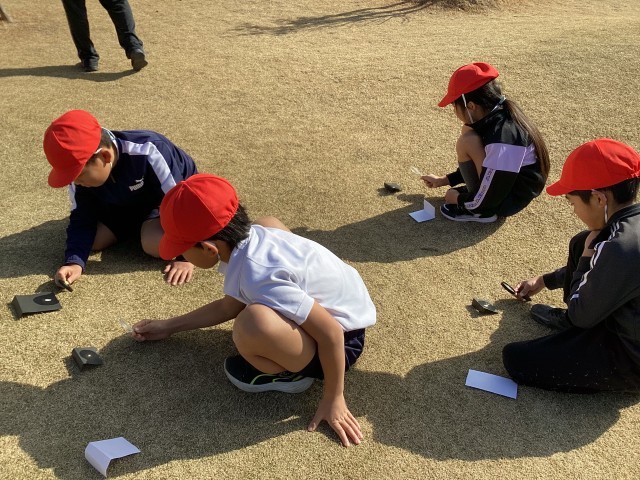 虫眼鏡で日光を集めて、紙に当てるとどうなるのかを調べました。雲から太陽が出てきた時は、思うような結果が得られて、あちらこちらから歓声が聞こえてきました。