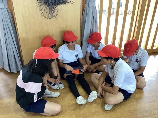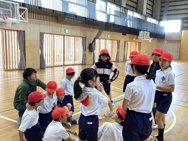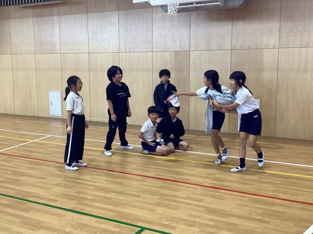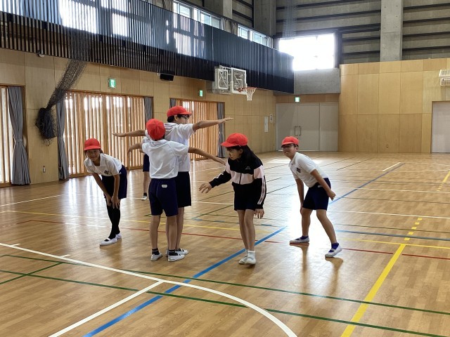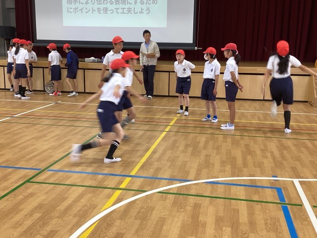 表現運動に取り組んでいます。自分たちで設定したテーマに合わせて、動きをグループで考えて表現しています。グループで見せ合い、アドバイスをし合うことでよりよいものへとつなげていました。
