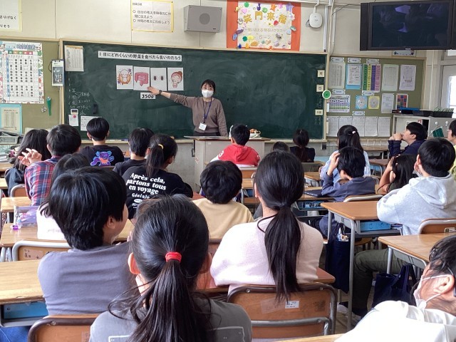 栄養士さんに来ていただき、野菜を食べる大切さや、1日にどれくらい食べたらよいのかについて教えていただきました。