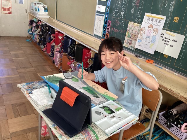 「校舎絵」に着色が始まっています。薄く丁寧に進めています。