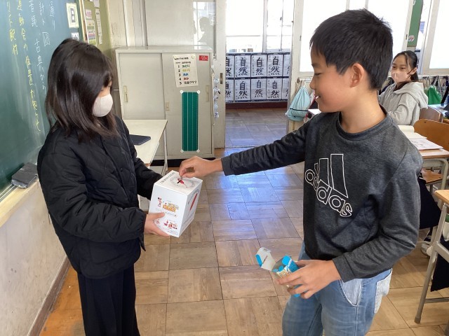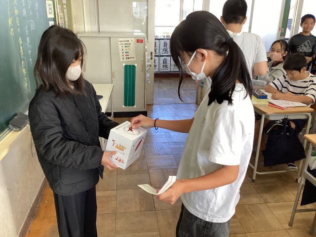 本日、集まったお金を代表委員会委員長と副委員長が社会福祉協議会の方に渡しました。全校のみなさんのおかげで、困っている人の助けにつながると思います。本当にありがとうございました。