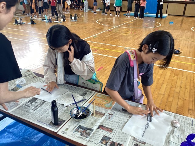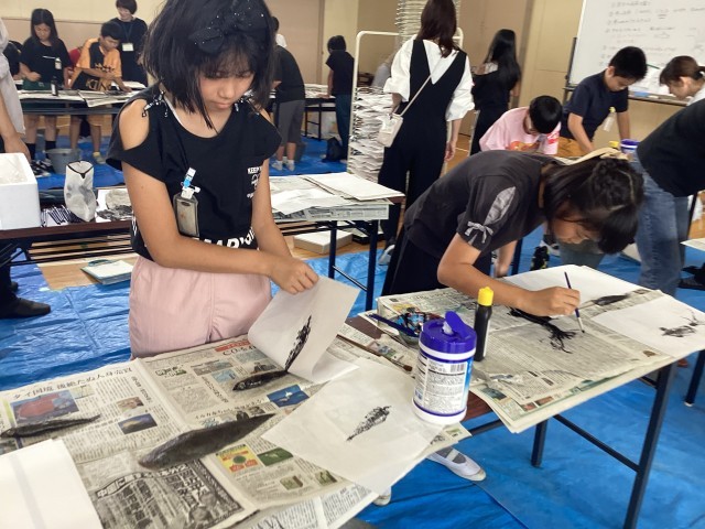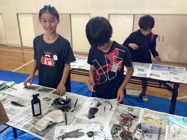 「魚拓に挑戦」魚やイカに墨を塗り、形を写し取りました。仕上げに目を描き込んで印鑑を押して完成です。