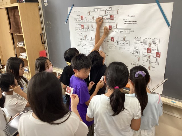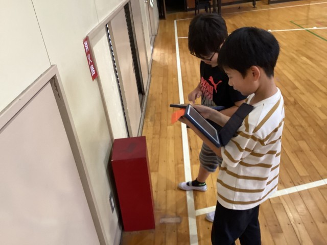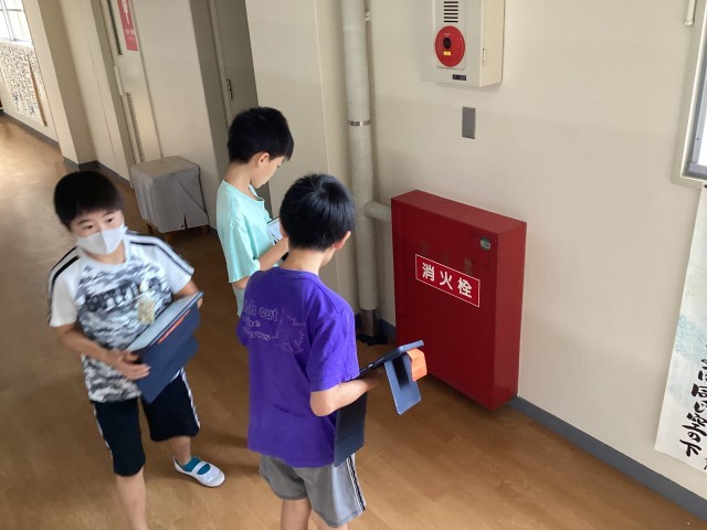 「学校には消化器が設置されているので、自分たちも使えるようになるといい。」という気付きから、学校中の消化器や消火栓、救助袋がどこにあるのか探しました。至る所に設置されていることに驚いていました。また、低学年のときの学校探検のようで懐かしかったようです。