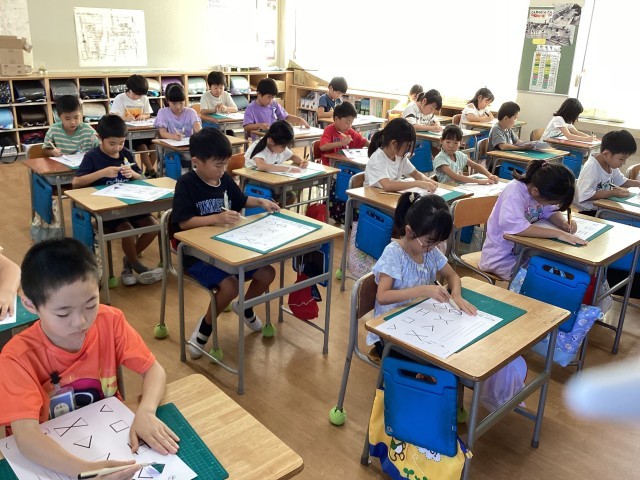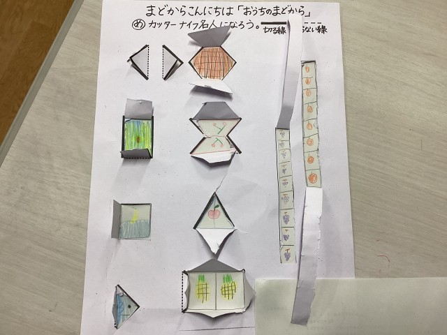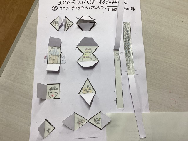 カッターナイフの安全な使い方を学んだ後、2回目の練習です。窓のデザインを考えて、いよいよ来週は作品作りに取りかかります。